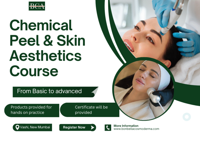 The Chemical Peel & Skin Aesthetics Course at Bonbela Cosmoderma Aesthetic, Vashi, Navi Mumbai is a comprehensive, industry-oriented training program designed for aspiring and practicing aesthetic professionals who want to master advanced skin treatments with clinical confidence. This course blends strong theoretical foundations with extensive hands-on practical training, ensuring students are fully prepared for real-world aesthetic practice.